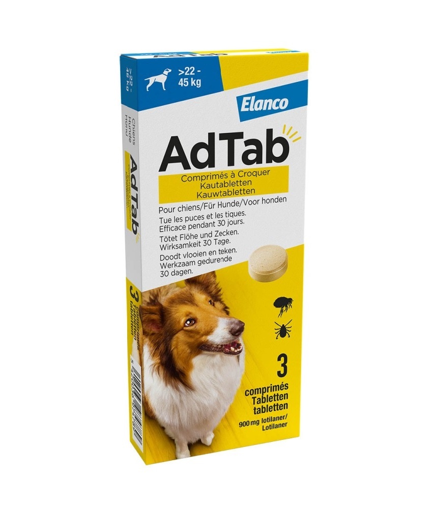 Suchst du nach einer einfachen und effektiven Methode, um deinen Hund vor Flöhen und Zecken zu schützen? AdTab Kautabletten wurden speziell für Hunde mit einem Gewicht von 22 bis 45 Kilogramm entwickelt und bieten 30 Tage lang zuverlässigen Schutz – mit nur einer schmackhaften Tablette pro Monat.