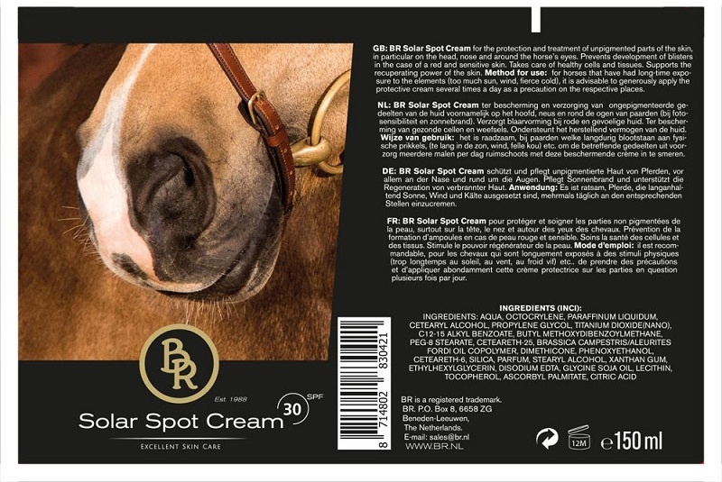 Die Formel unterstützt die natürliche Regeneration der Haut und pflegt sowohl geschädigte als auch gesunde Hautzellen. So hilft die Creme, Rötungen und Blasenbildung zu verhindern und hält die Haut geschmeidig und im Gleichgewicht. BR Solar Spot Cream ist für die tägliche Anwendung geeignet und besonders empfehlenswert für Pferde, die viel draußen stehen oder eine empfindliche Haut haben.