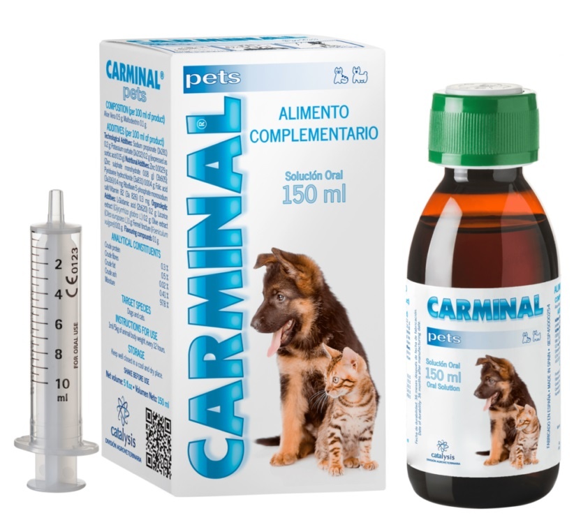 Carminal Pets unterstützt die Verdauung und eine gesunde Magenfunktion bei Hunden und Katzen. Natürliches ergänzendes Diätfuttermittel mit Aloe Vera, Glutamin, Fenchel und B-Vitaminen. Für den täglichen Gebrauch geeignet. Erhältlich in 150ml & 15x30ml.