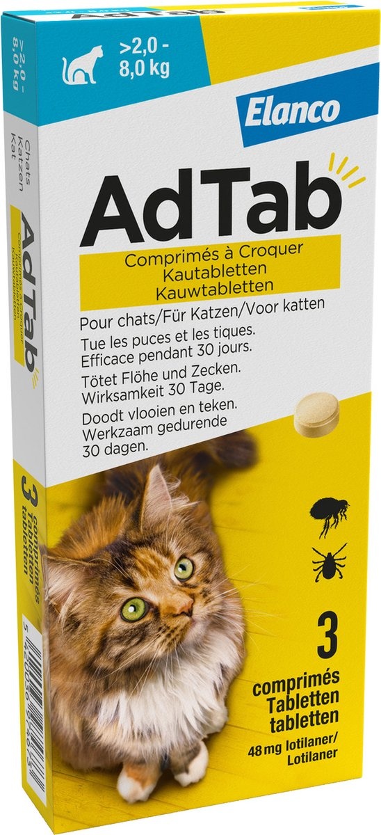 AdTab Chewable Tablets are specially designed for cats weighing between 2 and 8 kg, offering an effective and easy solution for controlling fleas and ticks. These small, tasty tablets contain the active ingredient lotilaner, which kills fleas within 8 hours and eliminates ticks within 18 hours after administration. After dosing, the effect lasts for 30 days, providing monthly protection against these parasites.