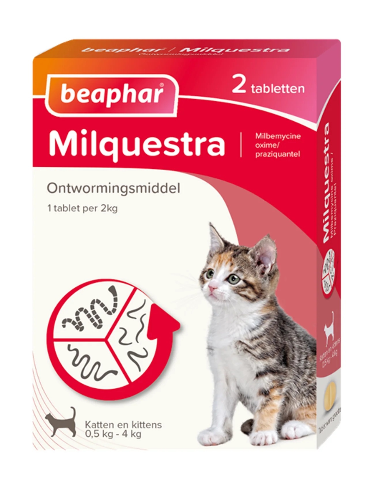 Milquestra worming tablets for small cats and kittens up to 2 kg. Effective against tapeworms, hookworms, roundworms and heartworm. Easy to give, beef-flavored, and broad-spectrum dewormer.
