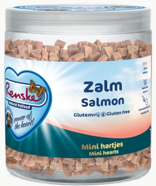 Renske Healthy Rewards Mini Hearts Salmon are natural, grain-free dog snacks made with a high percentage of salmon as the sole protein source. The heart-shaped treats suit sensitive diets thanks to the simple recipe without added salt or sugar. Their soft texture makes them ideal as a treat or for training. Suitable for all dog breeds from 9 weeks. The resealable 100 and 300 gram containers offer convenience and help keep the snacks fresh.