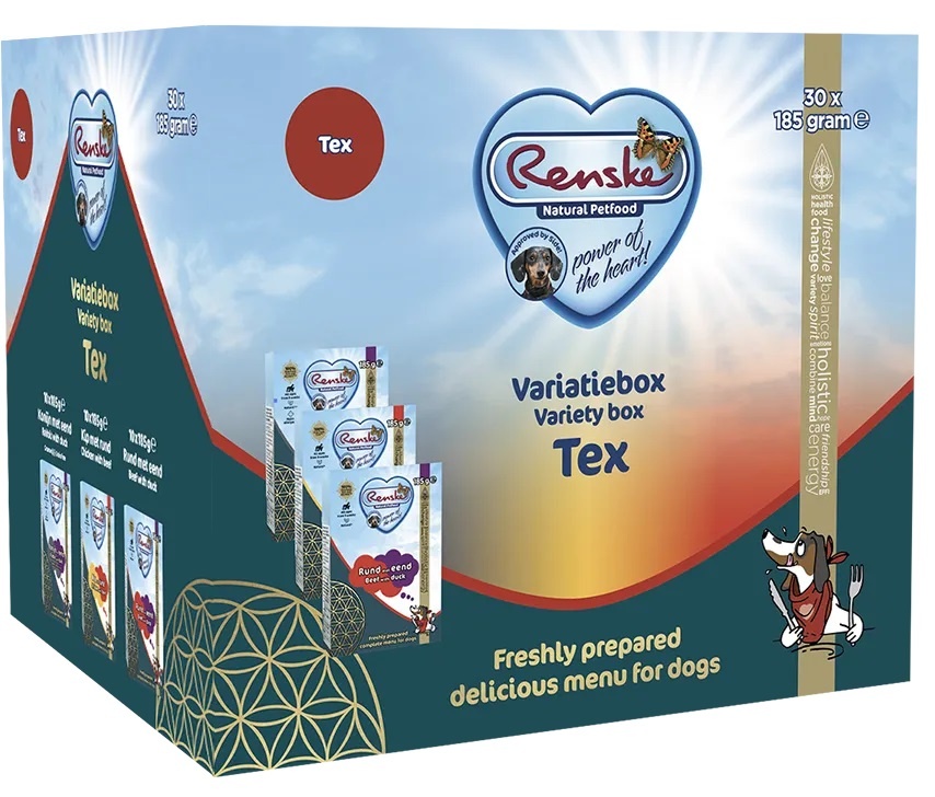 The Renske Variation Box Tex is a complete variety pack with 30 freshly prepared meals of 185 g for dogs of all ages and breeds. The box contains three tasty combinations: Rabbit with Duck (grain-free), Chicken with Beef, and Beef with Duck. The recipes are fully natural, easily digestible, and enriched with sea buckthorn, dried algae, yucca schidigera, and xylo-oligosaccharides, a natural source of prebiotics.