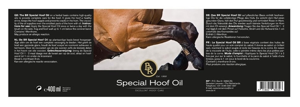 BR Special Hoof Oil 400 ml con pincel es un aceite de casco de alta calidad a base de plantas que proporciona un cuidado completo de los cascos de los caballos. El aceite contiene aceites valiosos que mantienen el casco flexible, previenen grietas en el cuerno y dan un brillo saludable. Su alta viscosidad garantiza que el aceite se mantenga en su lugar y se absorba de manera óptima.