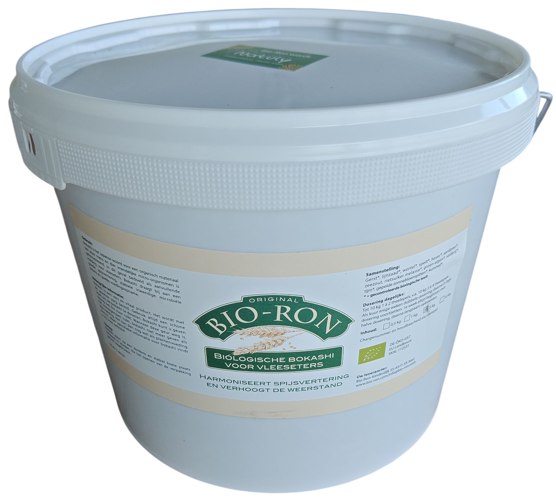 Dans la nature, les carnivores consomment aussi le contenu fermenté de l’estomac de leurs proies, riche en micro-organismes bénéfiques et en nutriments. Bokashi est l’alternative propre et saine au panse cru et soutient de manière optimale la flore intestinale et la digestion de votre animal. Combinez Bokashi avec Bio-Ron Veendrenkstof pour une symbiose puissante en soutien de l’estomac et de l’intestin.
