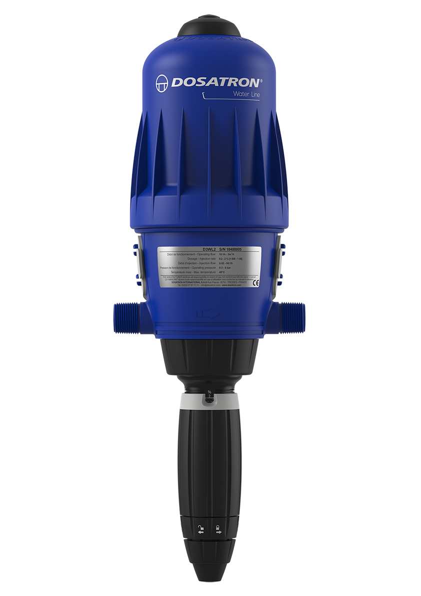 Pompe doseuse Dosatron D3WL2VF pour l’ajout précis de suppléments et de désinfectants dans les systèmes d’eau potable, sans électricité