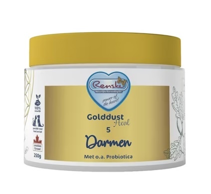 Golddust Heal 5 – Intestins est un complément alimentaire 100 % naturel pour chiens et chats, spécialement conçu pour soutenir une digestion saine et la flore intestinale. Cette formule contient une forte concentration de graines de lin canadiennes pures, riches en acides gras oméga-3 et en lignanes végétales, complétée par des plantes actives telles que la tormentille, le chêne d’été, l’encens indien et le gingembre.