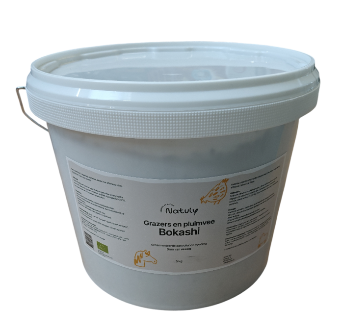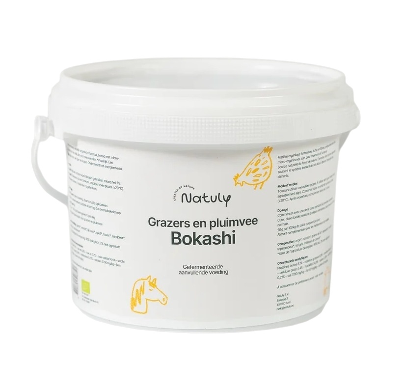 Natuly Bio Bokashi is een 100% biologisch en gefermenteerd aanvullend voer, speciaal ontwikkeld voor paarden en andere grazers zoals lama’s, alpaca’s, ezels, geiten en schapen. Ook pluimvee zoals kippen profiteert van deze waardevolle voeding. Bokashi ondersteunt de spijsvertering, bevordert een gezonde darmflora en versterkt het immuunsysteem dankzij de werking van effectieve micro-organismen (EM).