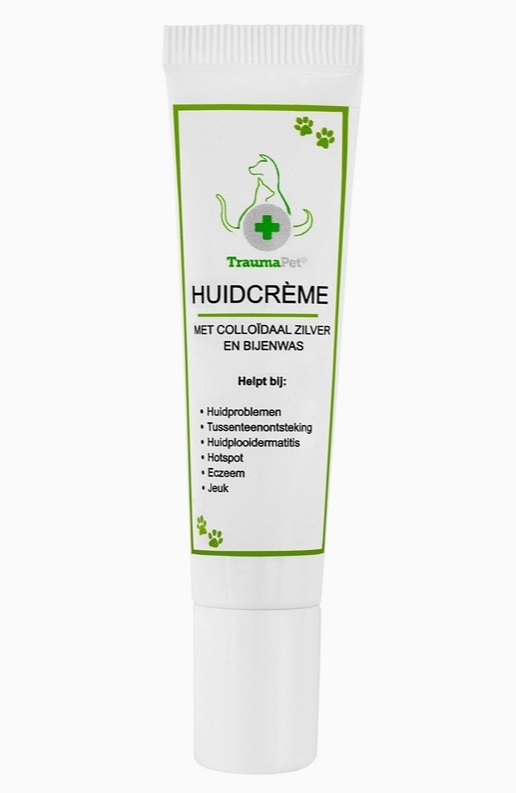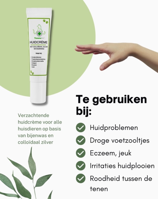 TraumaPet Huidcrème met colloïdaal zilver en bijenwas biedt natuurlijke verlichting bij jeuk, droge huid, eczeem en irritaties. Het ondersteunt het herstel van de huid en voorkomt verdere problemen. Geschikt voor alle huisdieren.