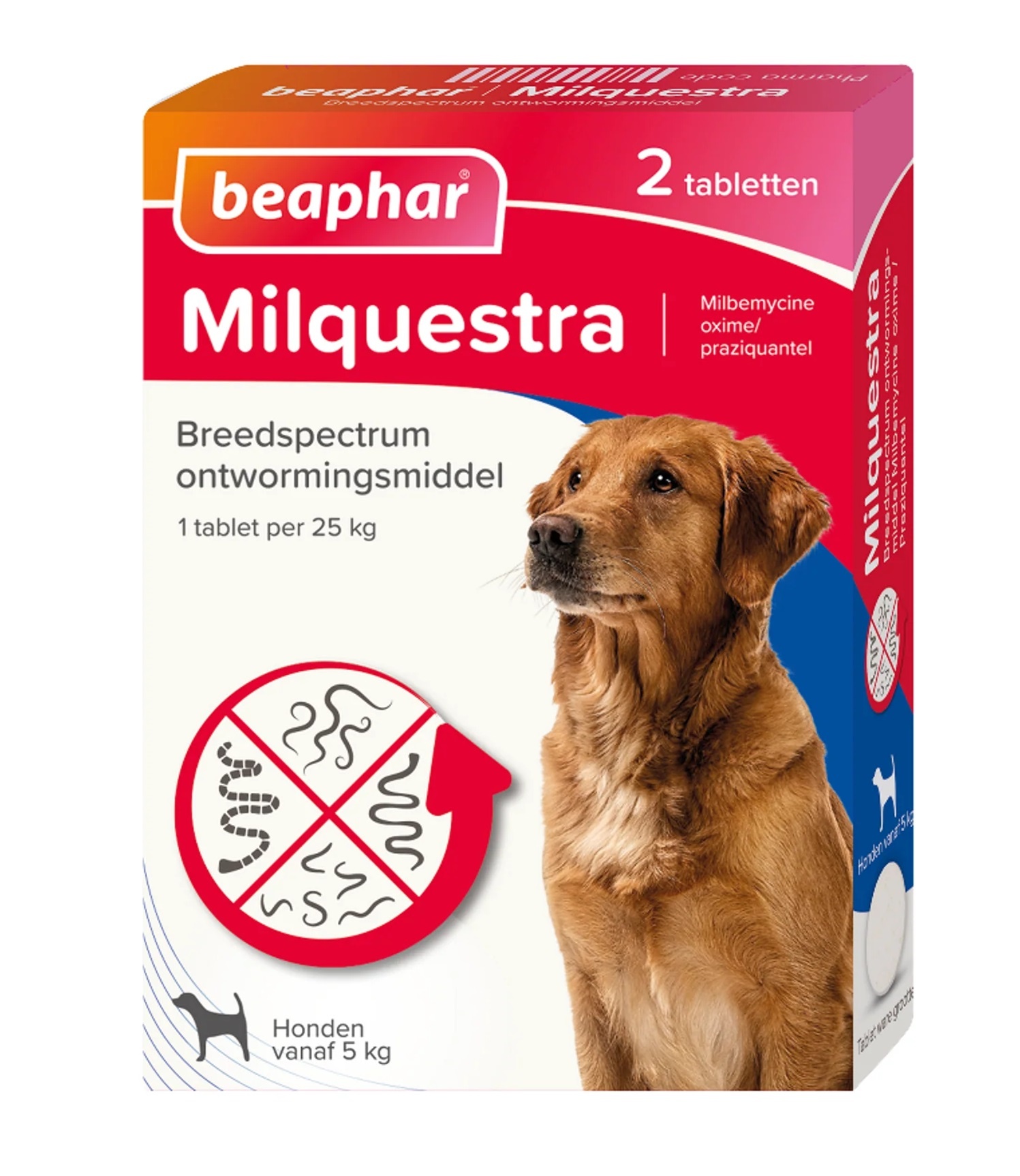 Milquestra hond 2 tabletten ontworming voor honden vanaf 5 kg. Breedspectrum middel met rundvleessmaak, werkzaam tegen lintworm, spoelworm, haakworm, zweepworm, longworm en hartworm.